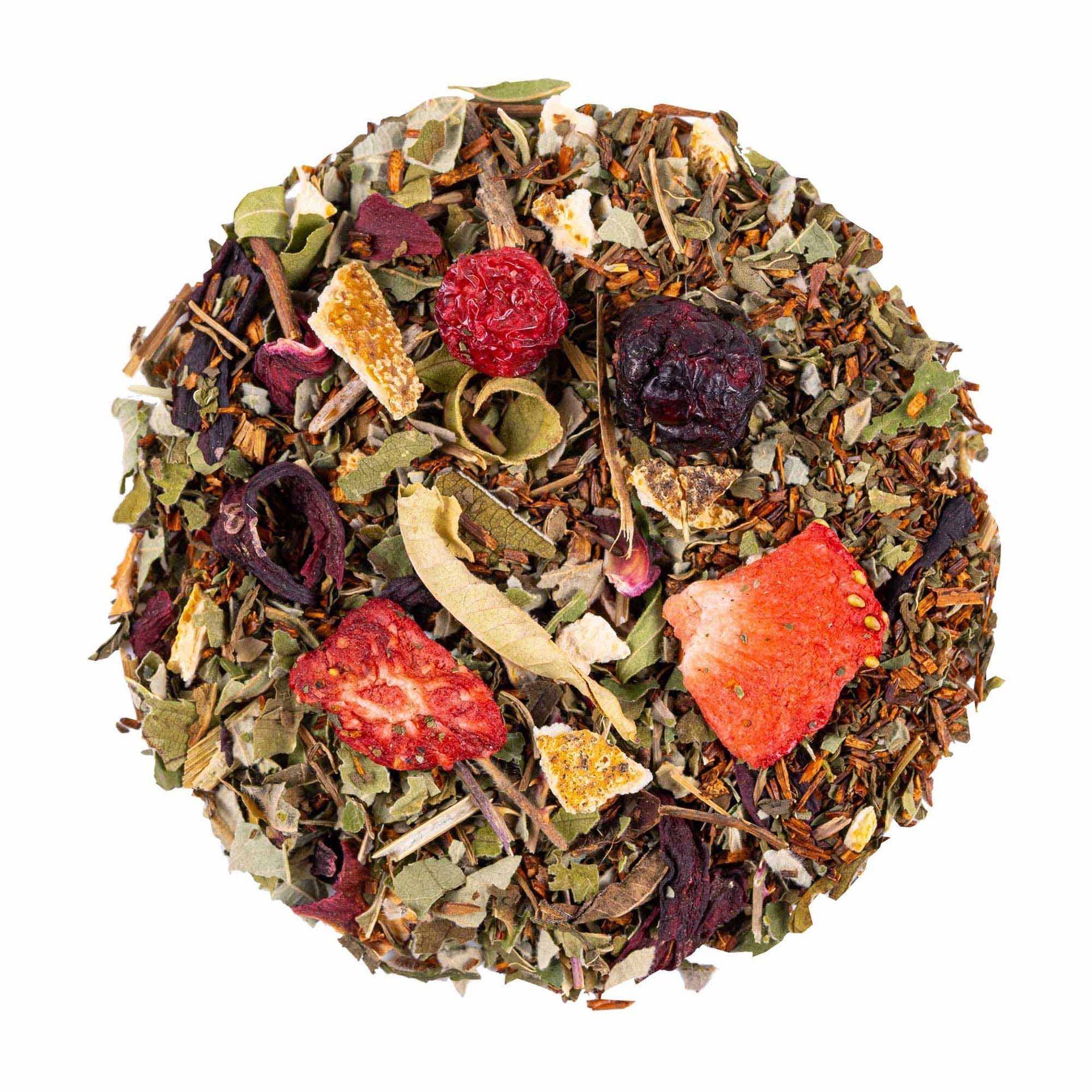 Rooibos naturel, menthe, hibiscus, feuilles de mûre, écorces d'orange, arôme naturel, verveine entière, fraise, cassis, baie de sureau, mûre, groseille. (Mélange premium élaboré avec des ingrédients issus de l'agriculture durable et des arômes naturels)